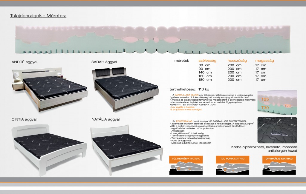 A Santa Lucia Silver egy tökéletes, kétoldalú matrac, mely a 9 keménységi zónájával mély, nyugodt alvást biztosít. A matrac az ágyékrésznél távtartókkal erősített, a gerincoszlop maximális tehermentesítése érdekében. Az ezüstszálas huzat anyaga 100 SANTA LUCIA SILVER TENCEL, kitűnően átereszti és leadja a nedvességet. A steppelt 200 g/m vatta a legkényelmesebb alvást szolgálja a baktériumok kifejlődését megelőző összetétellel. Antiallergén huzata levehető, mosható.
